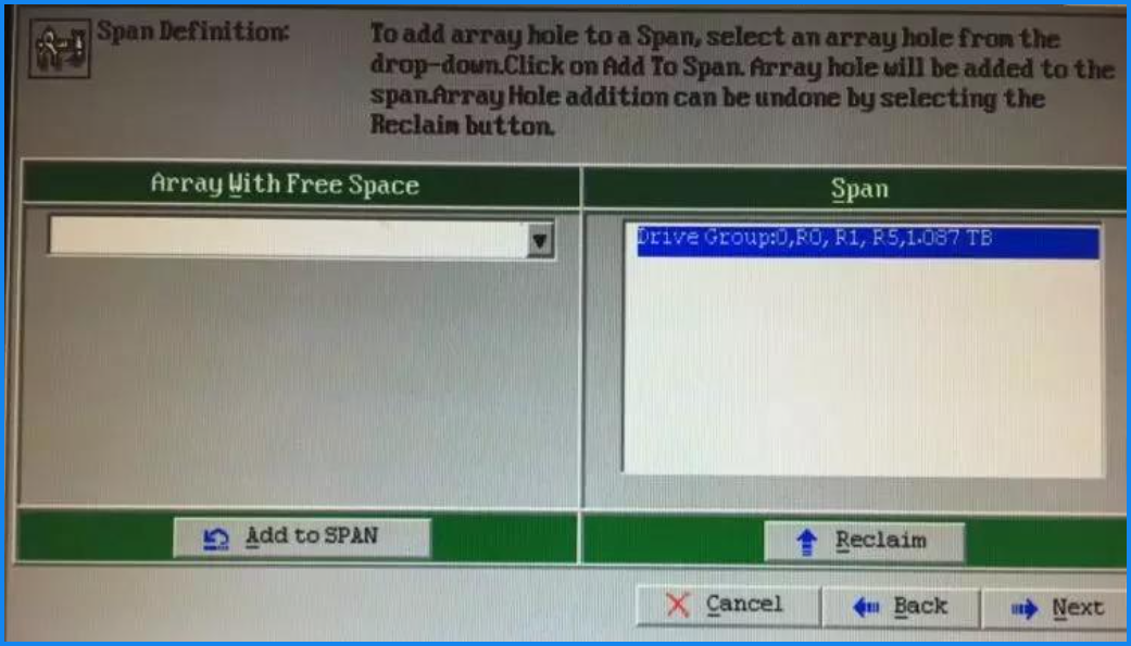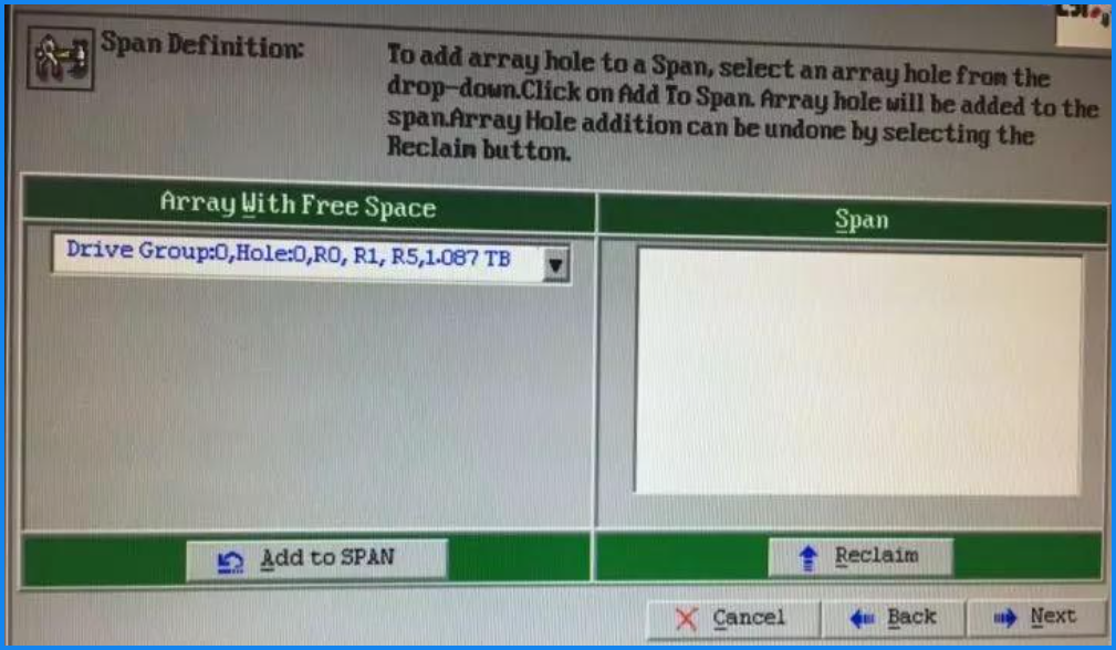 - 定义磁盘组,有一组的话添加一组,有多个硬盘组需要做raid的话,就确定多个硬盘组教程演示只有一组,直接点击Add to SPAN 将硬盘组添加到span中