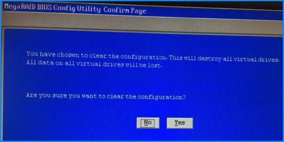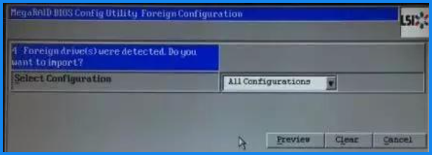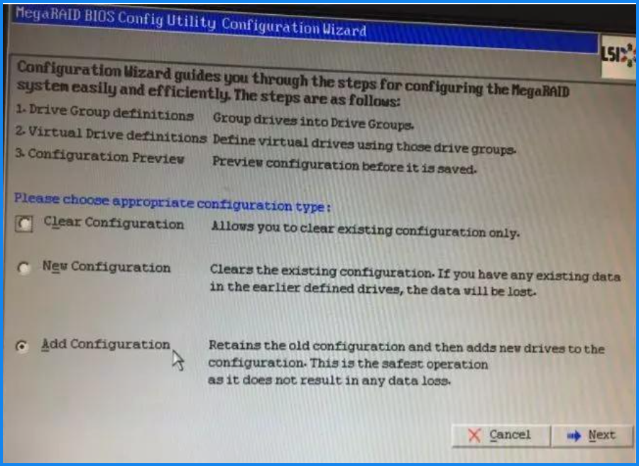 - 此步如果需要保留之前的RAID配置,直接选择Cancel即可,如果需要全部重新配置,可以点Clear