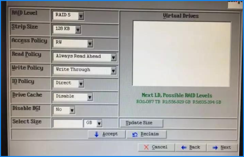 - 选配RAID组 先选择需要做的RAID格式,然后根据右侧图片中绿色文字给出硬盘的建议大小,填写Select Size如图,RAID0就填写1.087GB、RDIA1就填写556.929GB、RAID5就填写835.394GB