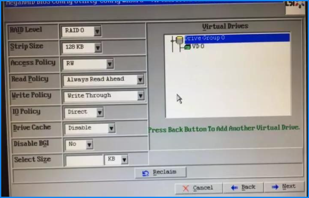 确认后,生成VD 0,产生RAID组配置。直接点击Next即可