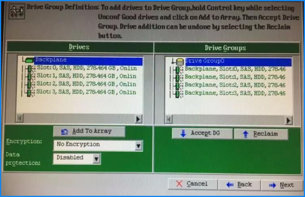 右侧添加好您需要组RAID的硬盘后,点击Accept DG来确认选择 然后Next