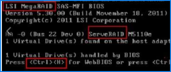 - 从开机自检中发现关键字LSI MegaRAID ServerRAID等RAID字样,同时底部带有